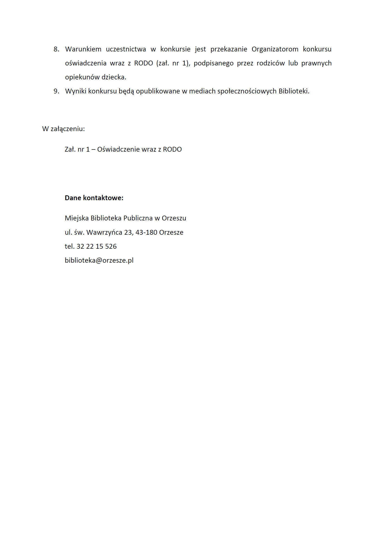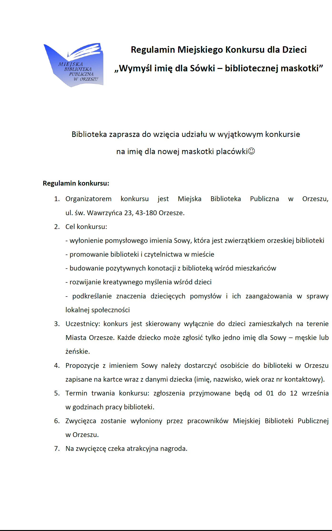 Zapraszamy wszystkie dzieci do wzięcia udziału w konkursie na imię dla Sowy, która została nową maskotką Biblioteki. Konkurs trwa do piątku 12 września do godz. 18:30. Propozycje trzeba dostarczyć osobiście do naszej siedziby. Szczegóły znajdziecie w regulaminie.